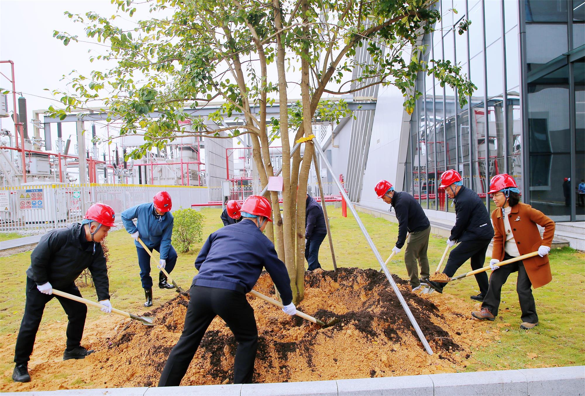 启动仪式结束后,在集团领导的带领下,参加植树活动的人员分区分组投入到南沙电力公司、珠江电厂园区的绿化植树工作中。大家热情高涨、分工明确、配合默契、干劲十足,挥锹铲土、扶树填土、踩实修整、围堰浇水……各道工序井然有序。在大家的共同努力下,铁冬青、宫粉紫荆、桃花新木、粉花风铃木、杨梅树和柚子树等50多棵新树木迎风挺立,错落有致,成为南沙产业园区新的风景线、春景图。
